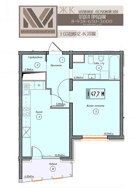 1-комнатная квартира 46.5 кв.м (10)