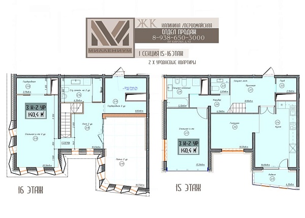 3-комнатная 2-уровневая квартира 140.4 кв.м