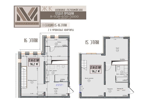2-комнатная 2-уровневая квартира 96.2 кв.м